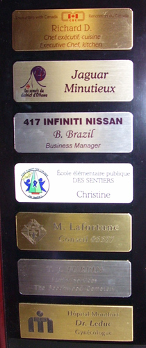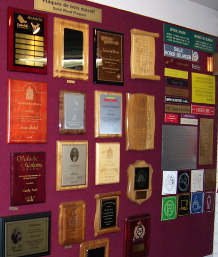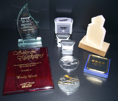 These products may be engraved or sand-blasted from wood, plastic, acrylic, glass or metal. Custom created as well as choose from a wide variety of stock items. Many companies use these for achievement and recognition. They are also ideal for conference, sporting and educational events. Special effect engraving and sublimation techniques are available upon request. Links to catalogues.